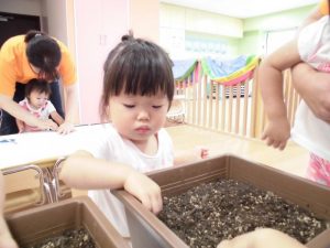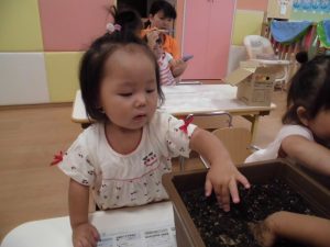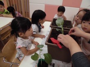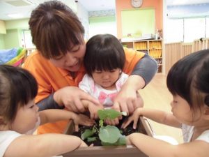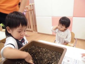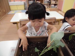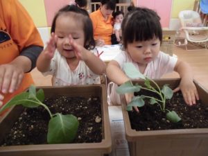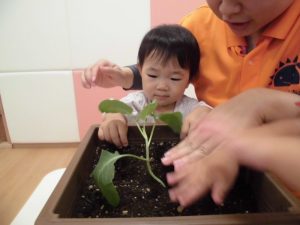 いちご組は「ブロッコリー」に挑戦します。始めにみんなで「苗をプランターに植え替える 」作業。土を嫌がる子がいるかな~、と思いましたが意外にもみんな積極的に土に触り、土の感触を楽しんでいました。