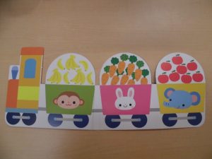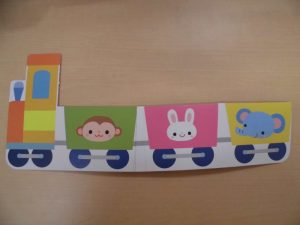 れな先生の『かもつれっしゃ』のカードシアターからスタートです!!「♪かもつれっしゃ しゅっ しゅっ しゅっ いそげ いそげ しゅっ しゅっ しゅっ こんどのえきで しゅっ しゅっ しゅっ つもうよにもつ がっちゃん♪」と歌いながら動物さんの貨物列車が出てきました。