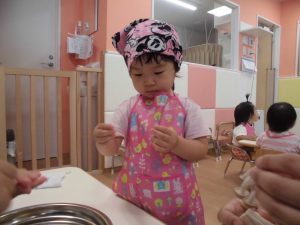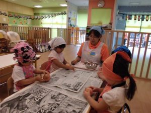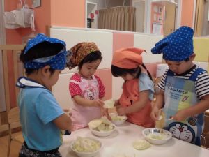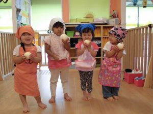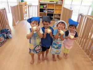 今週はりんご組の食育(給食作りのお手伝い)を紹介したいと思います。