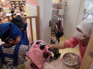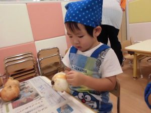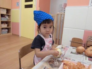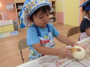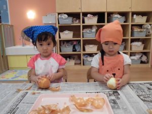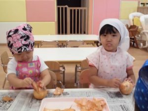 1枚1枚丁寧に皮をむく子や、一か所からどんどん剥く子、お家でお手伝いをしていてすいすいと慣れた様子でむく子、それぞれに楽しんでいました。