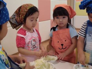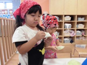 キャベツ剥きはとっても個性が出ていて、1枚ずつ丁寧に剥く子や小さくちぎりながら剥く子、2.3枚つかんで力に任せて剥く子など、見ていてとても面白かったです!