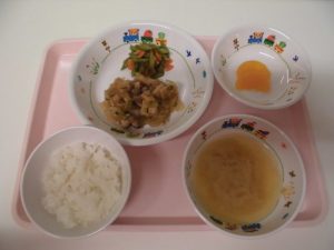 *ごはん *玉ねぎの味噌汁 *鶏肉のすき焼き風 *おかか和え *みかん缶