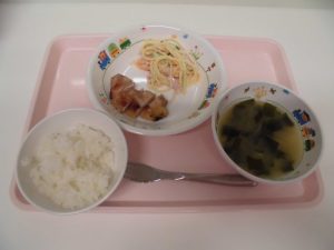 <幼児食> *ごはん *みそ汁 *照り焼きチキン *スパゲティサラダ <離乳食> *お...