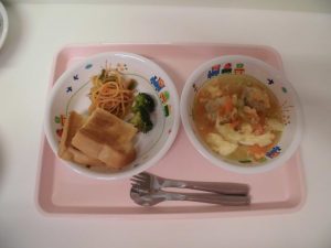 本日は誕生日会メニューです(^^♪ <幼児食> *パン *肉団子スープ *おかか和え *...