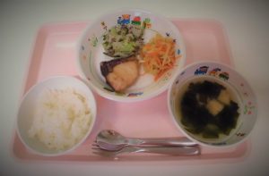 <幼児食> *ごはん *みそ汁 *ぶりの照り焼き *切り干し大根の煮物 *きゅうりとキャベツのゆかり...