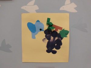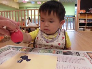 膨らませた風船に絵の具をつけて、、、風船の感触を感じながら、画用紙に押し付けるように
