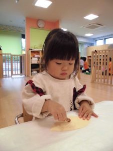 折り紙を3回折る作業に挑戦しました!何だか茶色いものが見えますね~♪