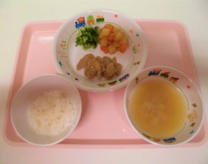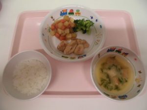 <幼児食> *ごはん *みそ汁 *チキンソテー塩味 *含め煮