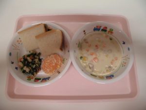 <幼児食> *パン *コーンクリームシチュー *ポパイサラダ *みかん