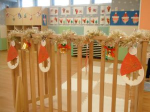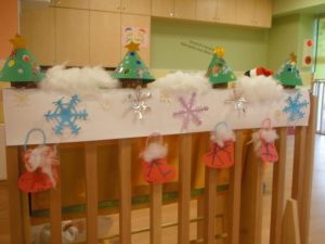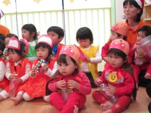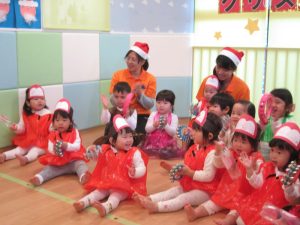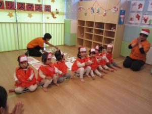 子どもたちだけではなく、保育者もサンタ帽子を被ってクリスマス会?を盛り上げます!(^^)!
