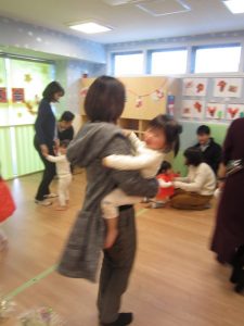親子リトミックもありました♪大好きなパパやママにぎゅっと抱きしめてもらったり、みんなで丸く輪になって体を動かしました(^_-)-☆