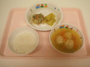 <幼児食> *ごはん *肉団子スープ *混ぜ混ぜサラダ *さつまいも甘煮 <離乳食> *おかゆ *肉...