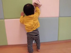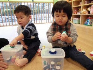ペットボトルのキャップを、ケースの中に落とす遊びをとても集中して取り組んでいました!!