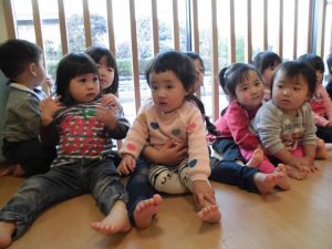 朝の会や帰りの会、絵本の読み聞かせの時は、りんご組の友だちの膝に座って過ごしています(^_-)-☆