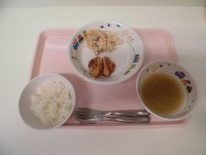 <未満児食> ・ごはん ・みそ汁 ・鮭の照り焼き ・そぼろ煮 ・おかか和え <離乳食> ・おかゆ ・...