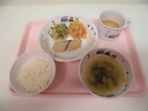 <未満児食> ・ごはん ・みそ汁 ・魚の西京焼き ・含め煮 ・おかか和え <離乳食> ・おかゆ ・み...