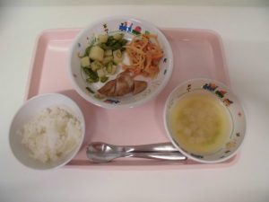 <未満児食> ・ごはん ・みそ汁 ・鶏肉のママレード焼き ・含め煮 ・スパゲティソテー ...