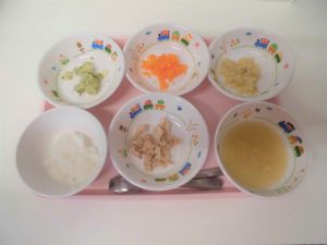 2019.04.11|給食ピックアップ 4月11日の給食? <未満児食> ・ごはん ・みそ汁 ・魚の竜田揚げ ・ひじきの炒り煮 ・粉ふき芋 ・バナナ <離乳食> ・おかゆ ・みそ汁 ・煮魚 ・茹でにんじん ・茹でじゃがいも ・つぶしバナナ 前へ 次へ