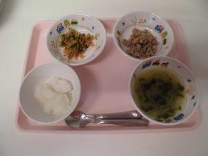 2019.04.12|給食ピックアップ 4月12日の給食? <未満児食> ・ごはん ・みそ汁 ・しょうが焼き ・もやしのナムル ・オレンジ <離乳食> ・おかゆ ・みそ汁 ・そぼろ煮 ・おかか和え 前へ 次へ