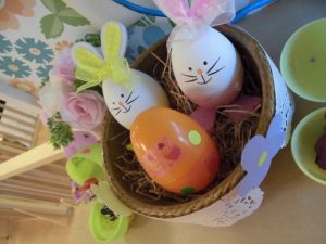 小田原園でも玄関にこんな可愛らしい卵型のウサギやおもちゃを飾って、