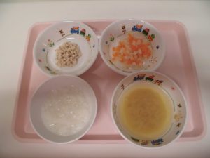 2019.04.25|給食ピックアップ 4月25日の給食? ?誕生会メニュー? <未満児食> ・ごはん ・みそ汁 ・煮込みハンバーグ ・粉ふき芋 ・おかか和え <離乳食> ・おかゆ ・みそ汁 ・そぼろ煮 ・含め煮 前へ 次へ