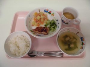 <未満児食> ・ごはん ・みそ汁 ・魚のから揚げ ・ポテトサラダ ・おかか和え <離乳...
