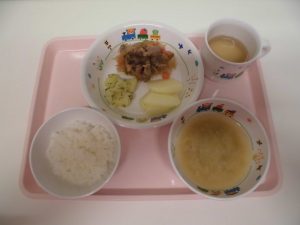 <未満児食> ・ごはん ・みそ汁 ・すき焼き風煮 ・粉ふき芋 ・りんご <離乳食> ・...