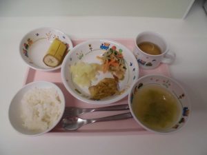 <未満児食> ・ごはん ・みそ汁 ・タンドリーチキン ・切干大根の煮物 ・粉ふき芋 ・バナナ &nb...