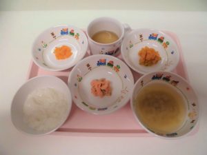 2019.05.14|給食ピックアップ 5月14日の給食? <未満児食> ・ごはん ・みそ汁 ・鮭の香りみそ焼き ・野菜炒め ・かぼちゃの甘辛煮 <離乳食> ・おかゆ ・みそ汁 ・鮭のみそ焼き ・茹でにんじん ・茹でかぼちゃ 前へ 次へ