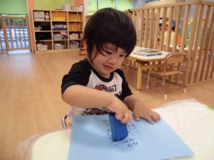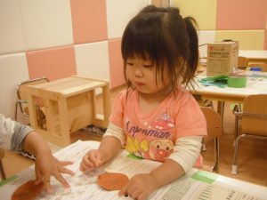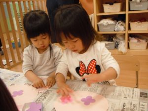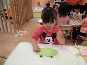 好きな色の花を選び、のりをつけるとペタペタ。のりは少しだけ指に取り、上手につけていました![]()