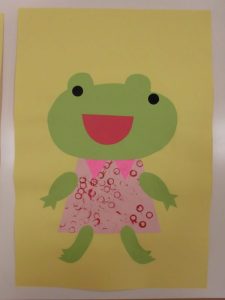 カエルの洋服の模様はレゴブロックでスタンプをしました。