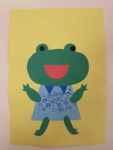 保育者が色画用紙で作ったカエルの顔に、黒いシールを貼るとかわいい目が出来ました。