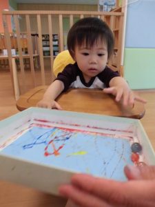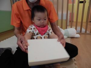 シャカシャカと保育者と一緒に箱を振るうのを楽しんでいたり、不思議そうに見つめていました?