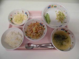 2019.06.07|給食ピックアップ 6月7日の給食? <未満児食> ・ご飯 ・味噌汁 ・焼肉 ・ポテトサラダ ・おかか和え ・りんご <離乳食> ・軟飯 ・味噌汁 ・そぼろ煮 ・スティックきゅうり ・おかか和え ・リんご 前へ 次へ