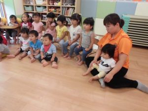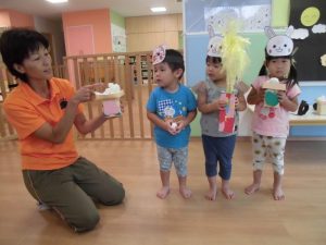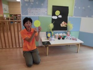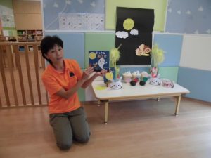 まず始めに、みわこ先生がお月さまのペープサートを使って十五夜についてのお話をしてくれました。