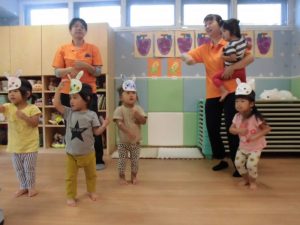 十五夜会の最後はみんなでお面をつけて、『月夜のポンチャラリン』という曲を踊りました