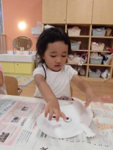 保育者が「糊はおかあさん指でつけるよー」と伝えると、みんな「これー?」と人差し指を出し、上手に糊を塗ることが出来ていました![]()
