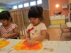 オレンジ色と黄色の両方を貼る子ども、黄色だけ、オレンジ色だけを選んで貼る子ども、みんな自分で好きな色を選びながら貼っていき、きれいなカボチャが出来ました![]()