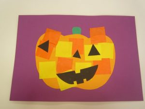 りんご組はカボチャの画用紙に四角く切った黄色とオレンジの折り紙を糊で貼りました(*^_^*)