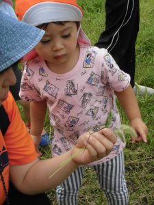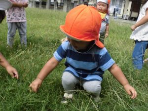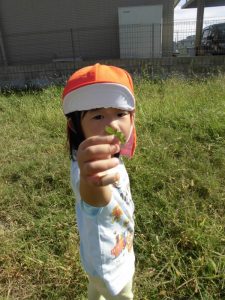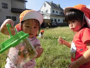 捕まえるのはまだ難しいですが、保育者にバッタを捕まえてもらうと