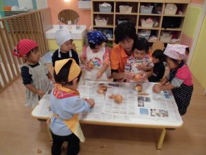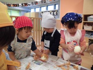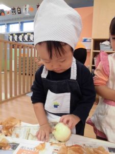 剥いた玉ねぎは、調理室へ運んで大きな声で、