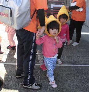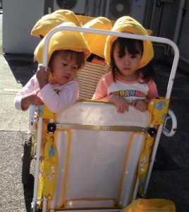 もも組、いちご組は散歩車に乗って、りんご組は保育者と手を繋いで避難しました。