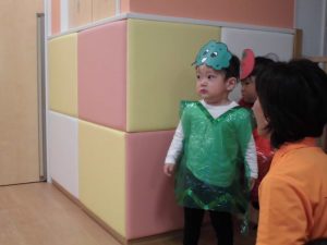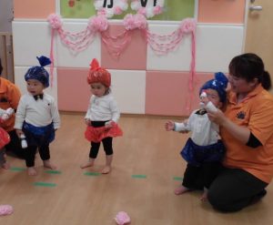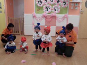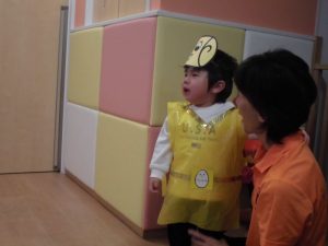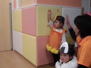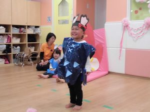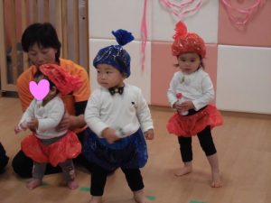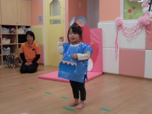保育者の声かけや動きに合わせて手や全身を使って、少しずつ楽しみながら練習に参加していました。手作りの衣装を着けると違和感からすぐに脱いだり、涙を流したりする姿が見られましたが、さて、本番は・・・![]()