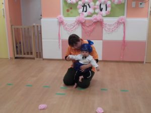 お母さんたちから離れ、はじめは泣いているお友だちもいましたが、少しずついつもの様子に戻り、「てをたたきましょう」や「サンタクロース」の歌を手遊びを交えながら楽しそうに歌っていました![]()