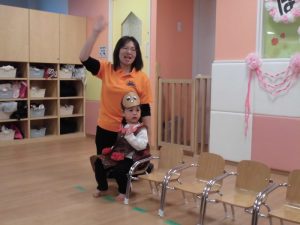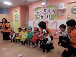 雰囲気に圧倒されて泣いてしまうお友だちもいましたが、曲が始まるとマラカスを持って可愛くおしりをフリフリしたり、回ったりしながら踊る姿に、思わず「か~わ~いい~![]()