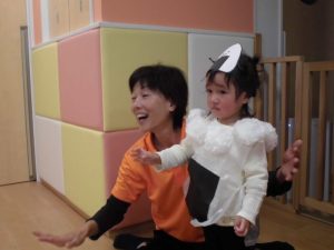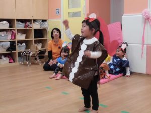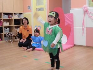 劇の練習が進むにつれて始めは恥ずかしがって踊れなかったお友だちも、だんだん表情が和らいで笑顔が見られるようになり、楽しそうに練習を行う様子が見られるようになりました。