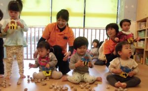 最初は「まめまきできるかな」という絵本を見ました![]()
