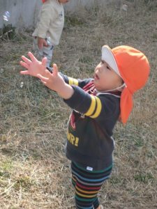 保育者がしゃぼん玉を吹くと、両手を伸ばしつかもうと頑張るもも組さん。