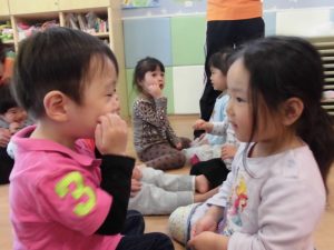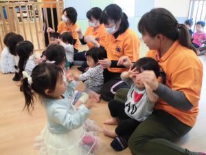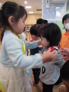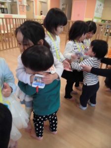 りんご組さんを中心にグループになったりペアになったりしながら遊び、楽しそうな笑い声が部屋中に響いていました![]()