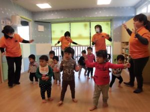 最初は音楽に合わせて『バスにのって』や『ガブチョ』などのふれあい遊びをしました![]()